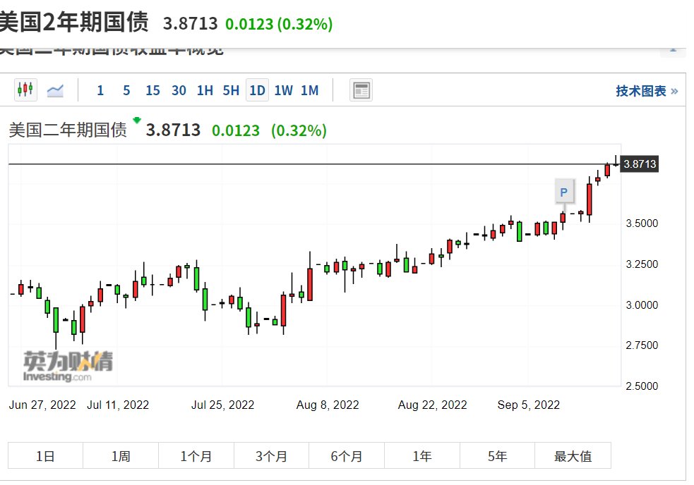 对利率前景敏感的两年期美国国债收益率一度突破3.9%,这是2007年11月1日以来该项收益率首次突破这一水平,创十五年新高。英镑兑美元一度跌破1.14美元,为1985年来首次。由于美元在美联储的加息风暴中势不可挡,英镑兑美元汇率今年以来的跌幅达到16%。