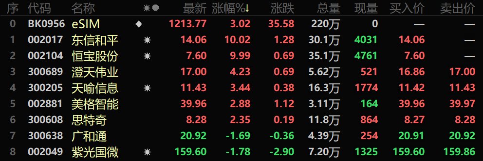 太平洋证券认为,eSIM将大幅降低物联网模组的制造成本和难度,提升模组厂商大规模出货能力,推动物联网应用发展。统计显示,A股中布局eSIM的有8只股票,昨天的交易日中,恒宝股份、东信和平强势涨停。恒宝股份的eSIM卡已实现批量供货。